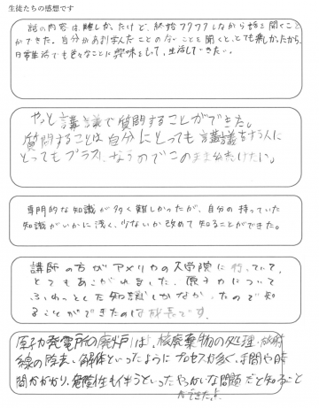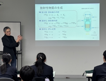 大学院工学研究院准教授渡辺直子先生より 「原子力発電所の廃止措置」と題してご講義いただき、映画「シン・ゴジラ」や福島第一原子力発電所などを例に、原子力発電所の廃止措置の内容や、日本の廃止措置の現状、課題、対策法について説明していただきました。
